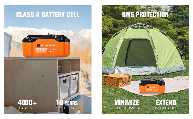 Overcharge/Over-discharge/Over-temperatureECO-WORTHY 12V 20Ah Portable LiFePO4 Deep Cycle Rechargeable Battery is suitable for various outdoor applications: fishfinder, trolling motor, camping, RV, boat, ect.