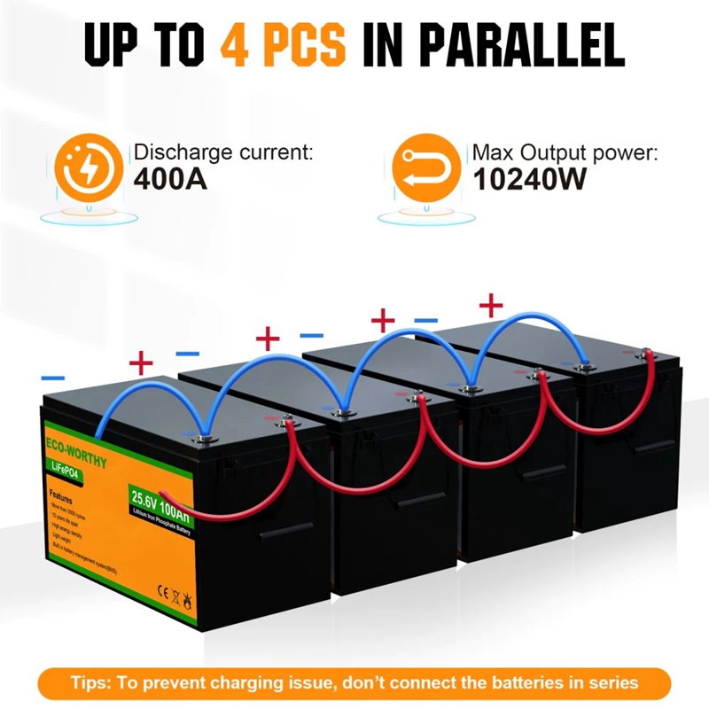 ·10-year Life & 3000+ Cycles: Eco-Worthy's 100ah LiFePO4 battery contains 3000+ cycle times, each lithium battery can run for more than 10 years, which is equivalent to 3 lead-acid batteries.·High Charging Speed: Eco-Worthy's 100ah LiFePO4 battery can reach 80% of power after one-hour charge, Under the same condition, the lead acid battery can only reach 20%. In the case of limited charging time, choosing a lithium battery can get enough energy faster.·Lightweight & Easy Installation: Eco-Worthy's 100ah LiFePO4 battery is lighter than Lead-Acid battery with the same capacity. Our 100ah LiFePO4 battery weight is 22.93 lbs, only 1/3 of Lead-Acid battery. More convenient carrying, any mount directions, no leakage risk, safer usage.·Capacity Expansion: Eco-Worthy's 100ah LiFePO4 battery can be connected in parallel and in series for larger capacity and voltage. Up to 4 identical batteries can be mounted as a series string as a 48V battery bank, and you can connect multiple batteries in parallel, while we suggest no more than 4pcs.·Multiple Applications: Eco-Worthy's 100ah LiFePO4 lithium battery is perfect for UPS backup, lighting, TV, e-Robot, loud speaker, coffeemaker, air conditioner, fridge, heater, etc.