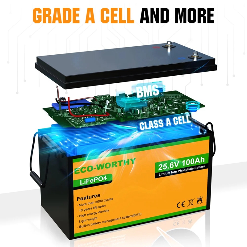 ·Perfect for Solar Off Grid System: ECO-WORTHY is professional seller in solar off grid system with battery and sold over 48600+ kit in past years. The 24V 100Ah lithium battery is an ideal choice for powering outdoor campsites and for easy installation indoors.·Long Life Cycle: Grade A LiFePO4 Cells makes the 100Ah battery more stable and greater, and the lithium rechargeable battery cycles more than 4000 times, which is more than 4 times comparing with 100AH Lead-acid batteries. And our lithium-iron batteries can maintain 80% capacity after 4000 deep cycles. Can be used in parallel, more suitable for 24V solar panel kit, less wires, less heat loss and less balance issue.·BMS High-efficiency Protection: The lithium iron phosphate battery has an excellent BMS (Battery Management System) function, which can prevent its overcharge, over-discharge, charge over-current, discharge over-current, short-circuit, cell voltage self balance, high-temp discharge cut off. Recharge from 0% to 80% within 3-4 hrs.·Lightweight Lithium Battery: ECO-WORTHY 24V 100Ah lithium battery weighs only 39.15 lbs, only 1/3 of the weight of a lead-acid battery. It makes installation and movement more easier.·Multiple Applications: The LiFePo4 lithium battery is the most stable battery and compatible with RV/campers caravans, ships, golf carts, solar systems or can be used as an emergency power supply.
