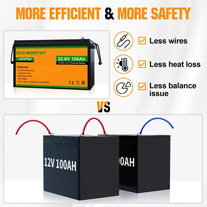 ECO-WORTHY LiFePO4 24V Lithium Iron Phosphate Battery has twice the power, half the weight, and lasts 8 times longer than a sealed lead acid battery, no maintenance, extremely safe and very low toxicity for environment. Our line of LiFePO4 offer a solution to demanding applications that require a lighter weight, longer life and higher capacity battery.