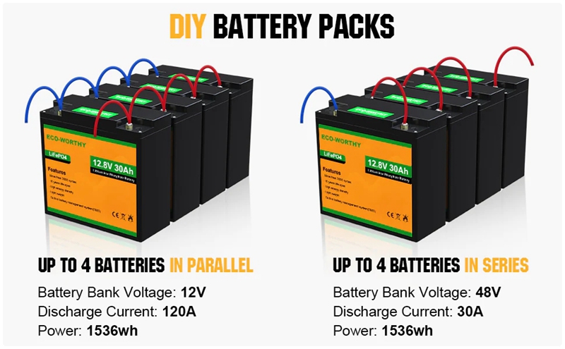 ·10-year Life & 3000+Deep Cycles: ECO-WORTHY's 150ah LiFePO4 Lithium Battery contains 3000+ deep cycles, each lithium battery can run for more than 10 years, which is 3 times longer cycles than other AGM batteries on the market.And our lithium-iron batteries can maintain 80% capacity after 3000 deep cycles.·Safer Metal Shell Design: Explosion valve and metal steel shell design protect it from fire and explosion. And it has a more stable built-in 120A BMS to protect it from overcharge, over-discharge, charge over-current, discharge over-current, short-circuit, cell voltage self balance, high-temp discharge cut off.·Lighter but More Power: Our LiFePO4 Battery has compact size design, which makes it smaller in size and 1/3 the weight of the lead acid battery at the same capacity, much more convenient for you to remove and place it.·Application: The150Ah Lithium Iron Phosphate Battery has 1920Wh Energy, and can be expanded to 30.7kwh by wired in 4S4P, Perfect for trolling motor, RV, campers, marine, travel trailer, solar power system, motor homes, UPS, off-grid etc.·US Warehouse & Fast Delivery: 3-5 Days fast delivery for US mainlands, we ship the battery from our local warehouse in California. Our online services with quick feedback within 24 hours, if you have any questions, please feel free to contact us, we will do our best to meet your needs.