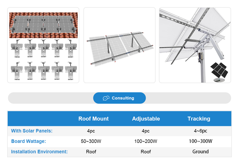 ECO-WORTHY Adjustable/Roof/RV/Tracking Multi-Piece Solar Panel Mounting Brackets has the capability to fit 1-4 pieces of different size ECO-WORTHY panels or other brands standard panels. It's ideal for larger installations, such as ground, flat roof, cabins and backyard sheds. Anywhere roof mounting is not a possibility, this solar panel mount can be applied.